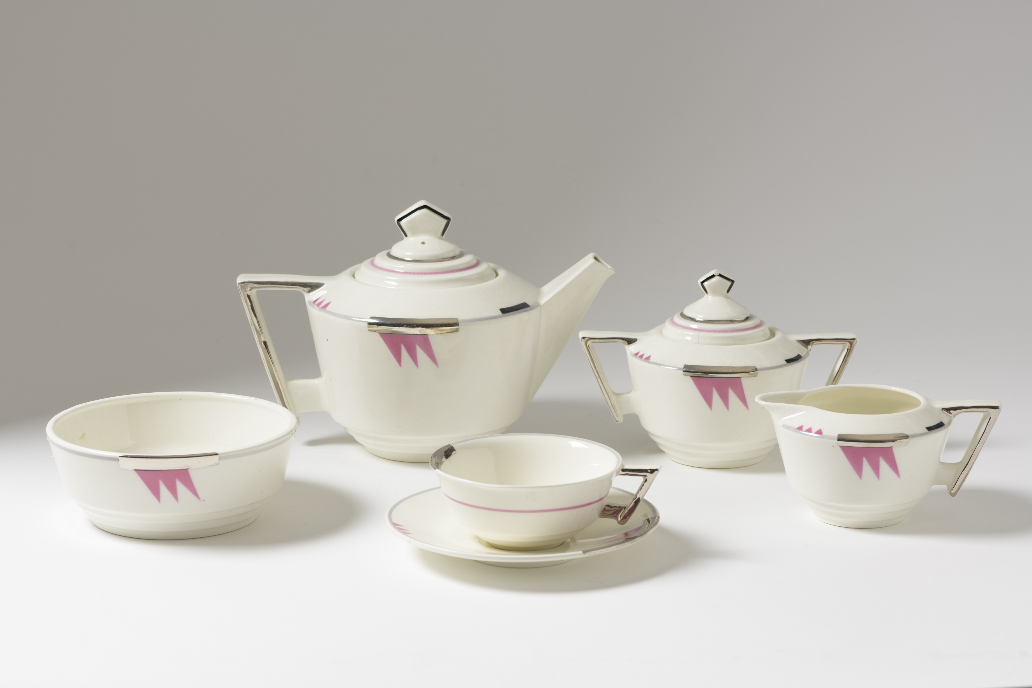 Title | Theepot met deksel, roomkan, suikerpot met deksel, spoelkom, kop en schotel |