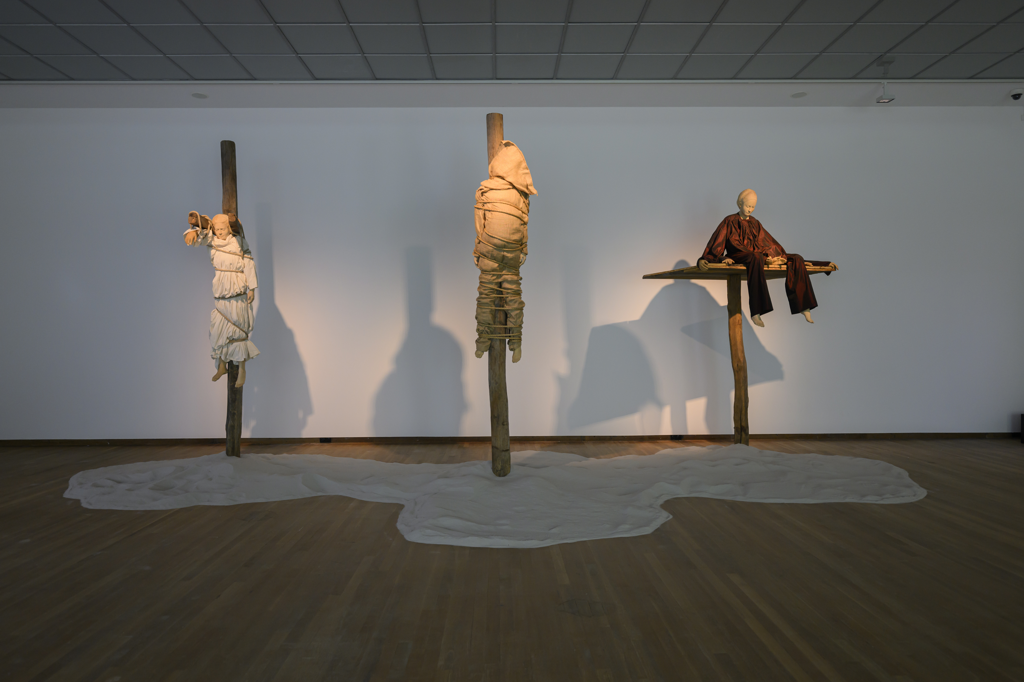 Dimensions | Lengte: 185 cm (hangende figuur) Breedte: 45 cm (hangende figuur) Diepte: 86 cm (hangende figuur) Hoogte: 380 cm (hangende figuur) Lengte: 220 cm (gebonden figuur) Breedte: 57 cm (gebonden figuur) Diepte: 43 cm (gebonden figuur) Hoogte: 420 cm (gebonden figuur) Diepte: 106 cm (zesarmig figuur) Hoogte: 230 cm (zesarmig figuur) Lengte: 171 cm (zesarmig figuur) Breedte: 135 cm (zesarmig figuur) Tekst: zaalvullend, totale afmeting installatie variabel: 14 x 5,2 x 3,8 meter |