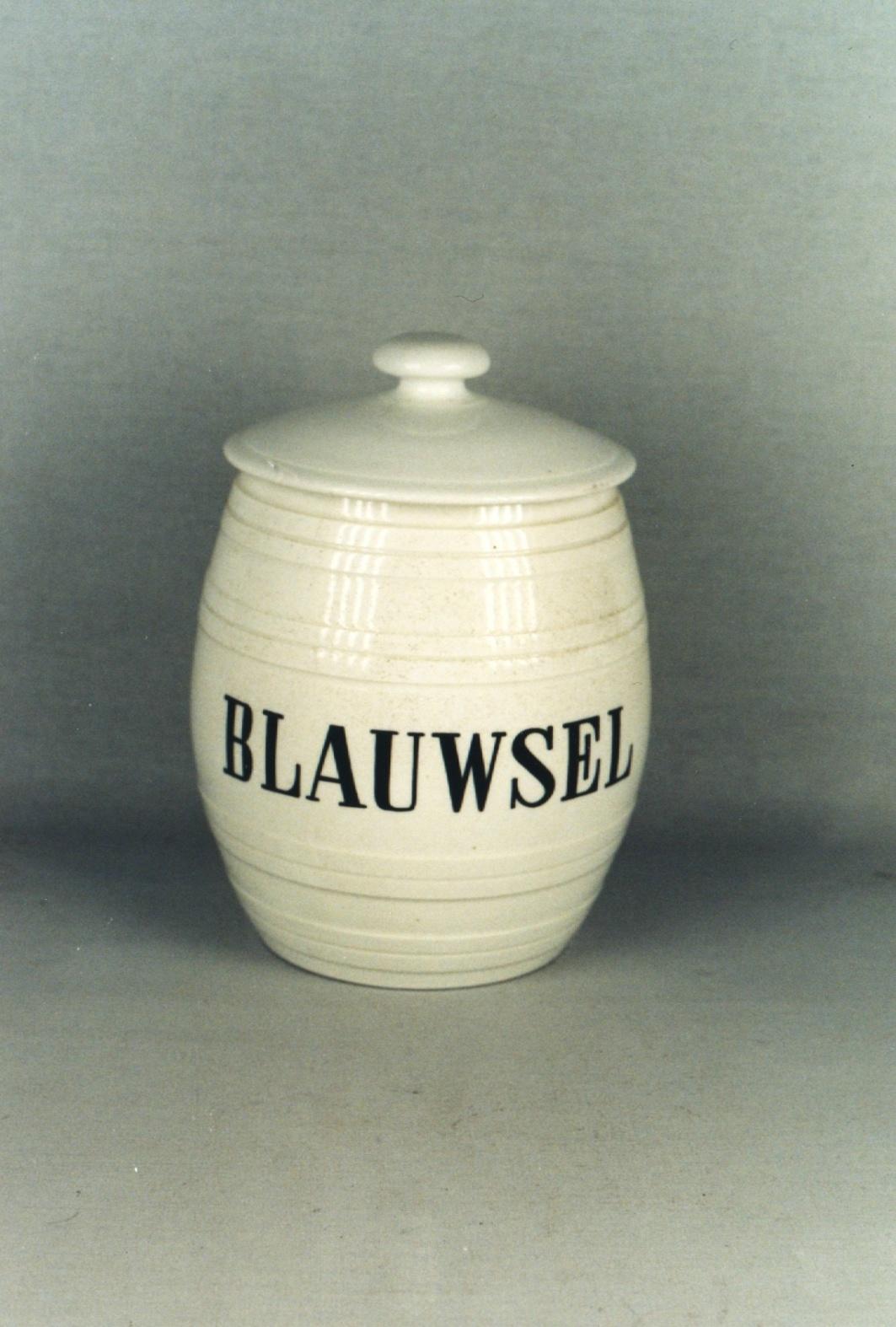 Titel | 3 Voorraadpotten met deksel waarop: SUIKER, AARDAPPELMEEL, BLAUWSEL |