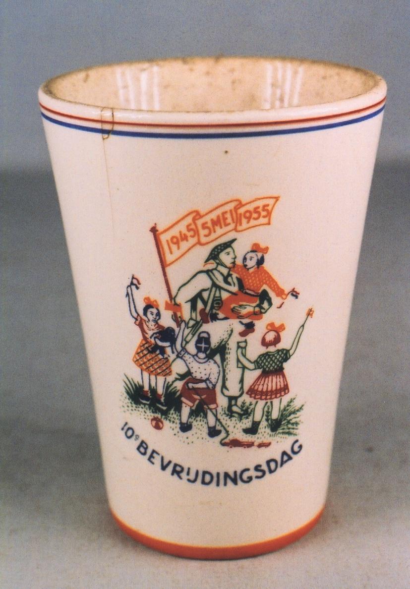 Titel | Beker waarop juichende kinderen die een soldaat verwelkomen met wapenschild en de nederlandse vlag |