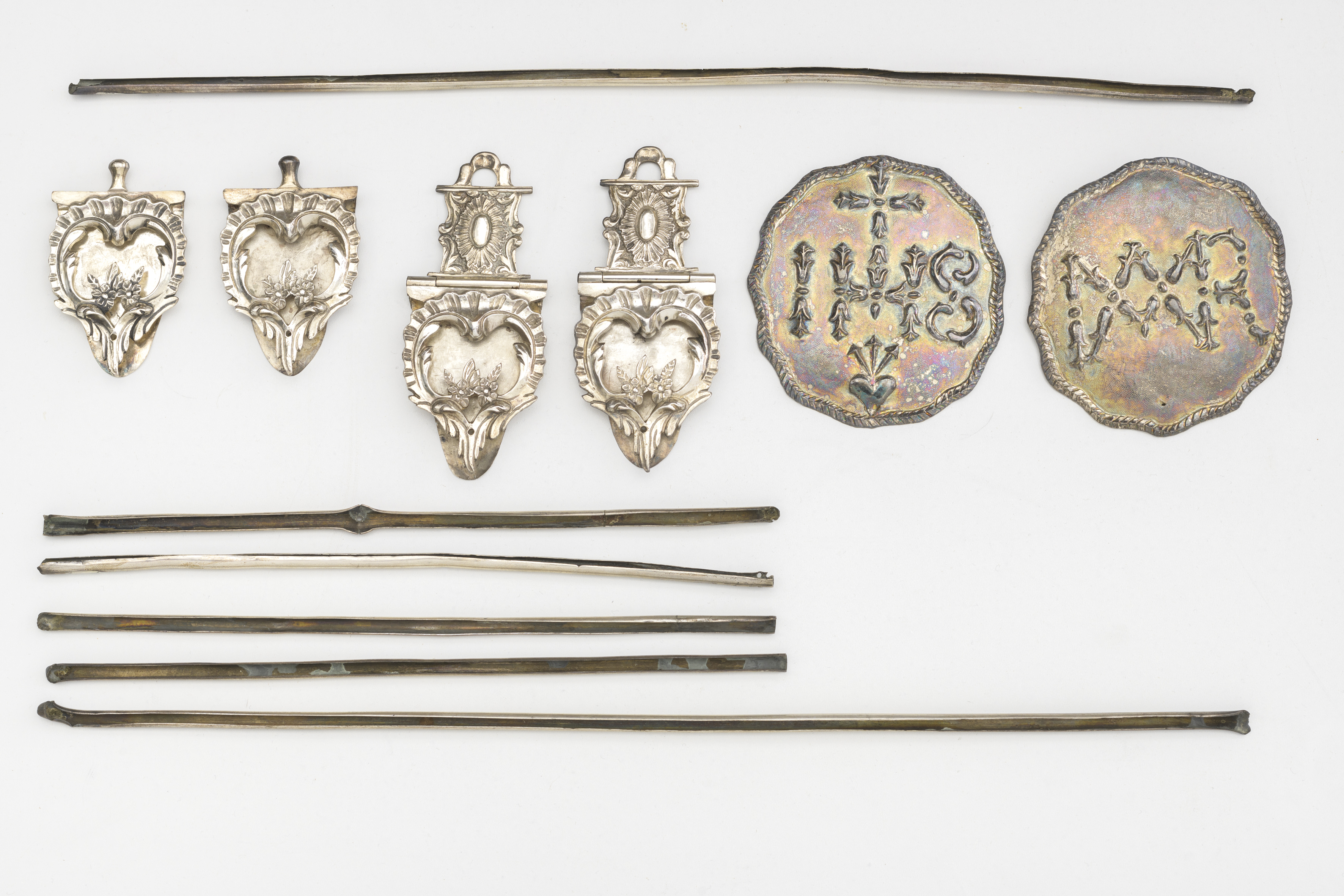 Titel | Boekbeslag, bestaande uit twee lange en vier korte randlijsten twee paar klampen en twee plaquettes |