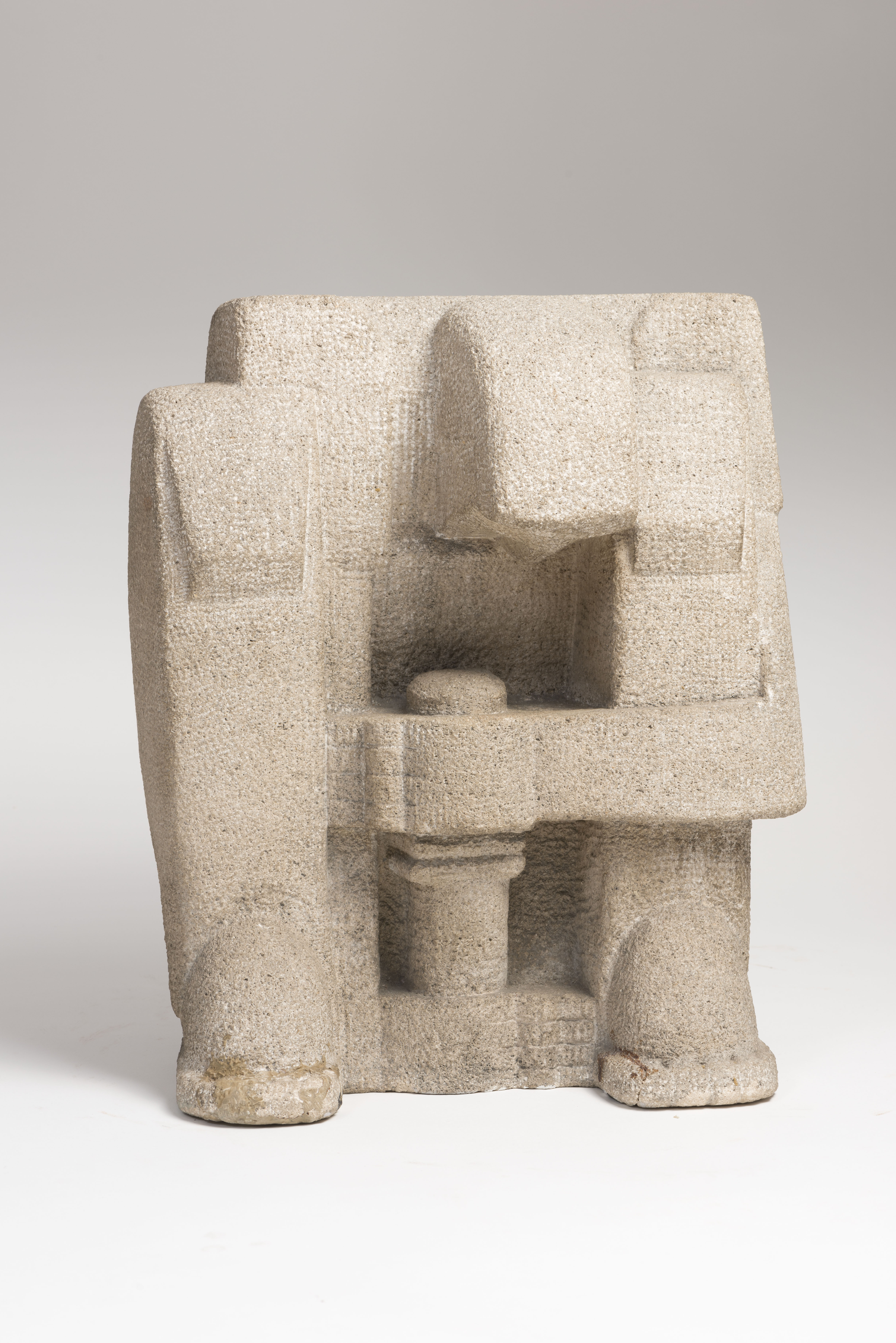 Fysieke beschrijving | De pottendraaier zit nog gevangen in de euvillesteen waaruit hij gemaakt is. De blokvorm wordt nog geaccentueerd door de rechthoekige abstrahering van de lichaamsvormen. Om de pot min of meer vrij te zetten is het beeld dieper ingehakt, wat het karakter van de steen enigszins aantast. Het oppervlak is bewerkt met een bouchardhamer waardoor een ruw ruitjeseffect onstaat. |