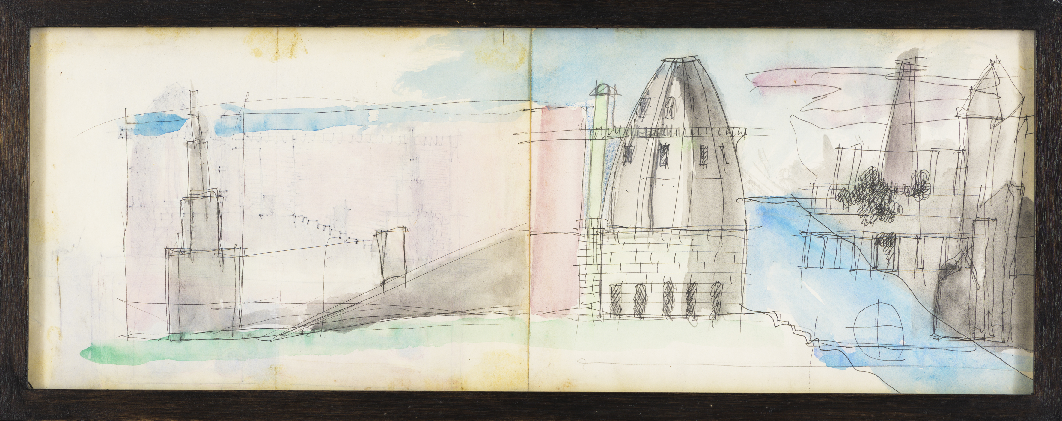 Titel | Ontwerp Bonnefantenmuseum: schetsontwerp middenvleugel en koepel aan de Maas |