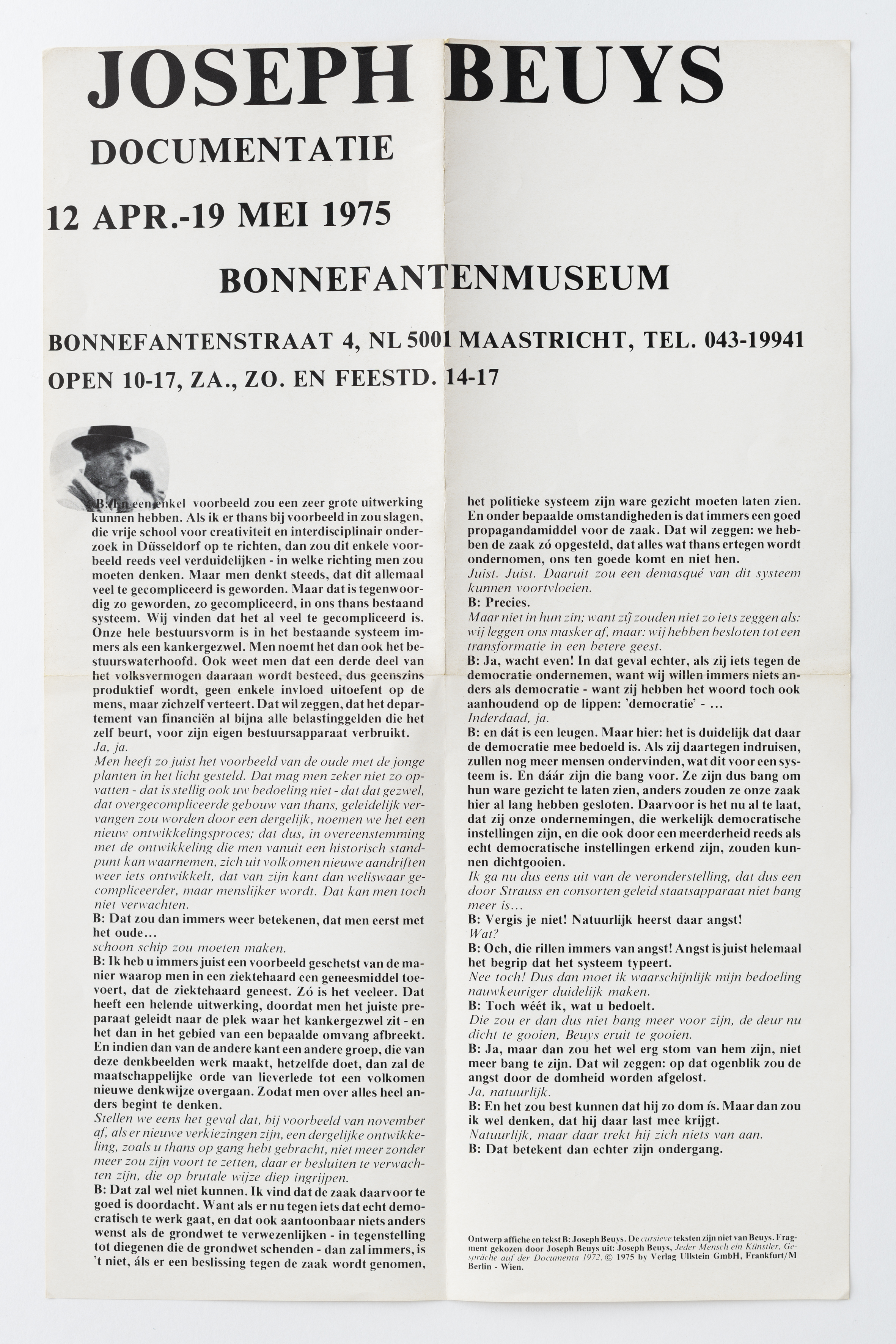 Titel | Affiche: Joseph Beuys. Documentatie. Maastricht, Bonnefantenmuseum 12.4-19.5.1975; oplage 800 exemplaren, 1 exemplaar opgeplakt |