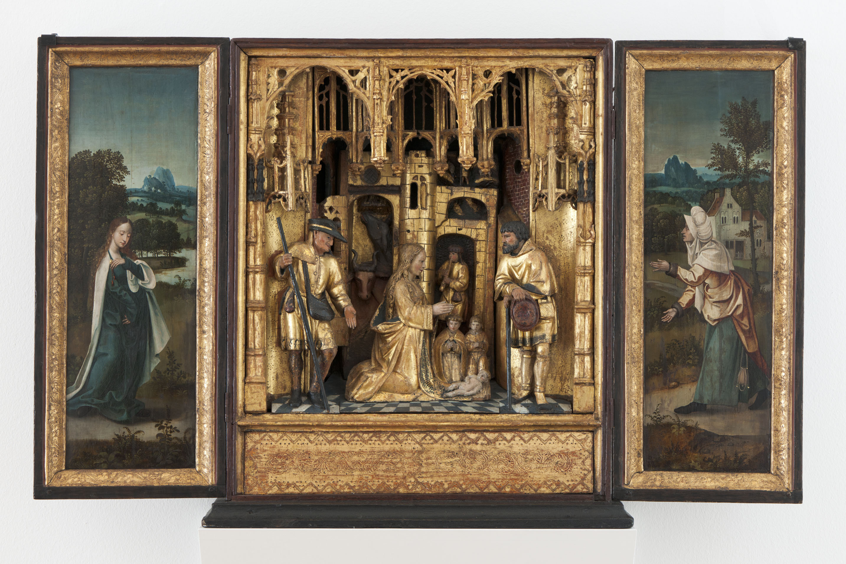 Afmetingen | Hoogte: 71,5 cm (middengedeelte) Breedte: 59 cm (middengedeelte) Diepte: 18 cm (middengedeelte) Hoogte: 75,5 cm (geheel open) Breedte: 119 cm (geheel open) Diepte: 23,5 cm (geheel open) Hoogte: 71,5 cm (geheel zijluiken) Breedte: 29,5 cm (geheel zijluiken) Hoogte: 30 cm (herders) Breedte: 11 cm (herders) Hoogte: 26 cm (groep madonna) Breedte: 22 cm (groep madonna) Gewicht: 21 kg (geheel) |