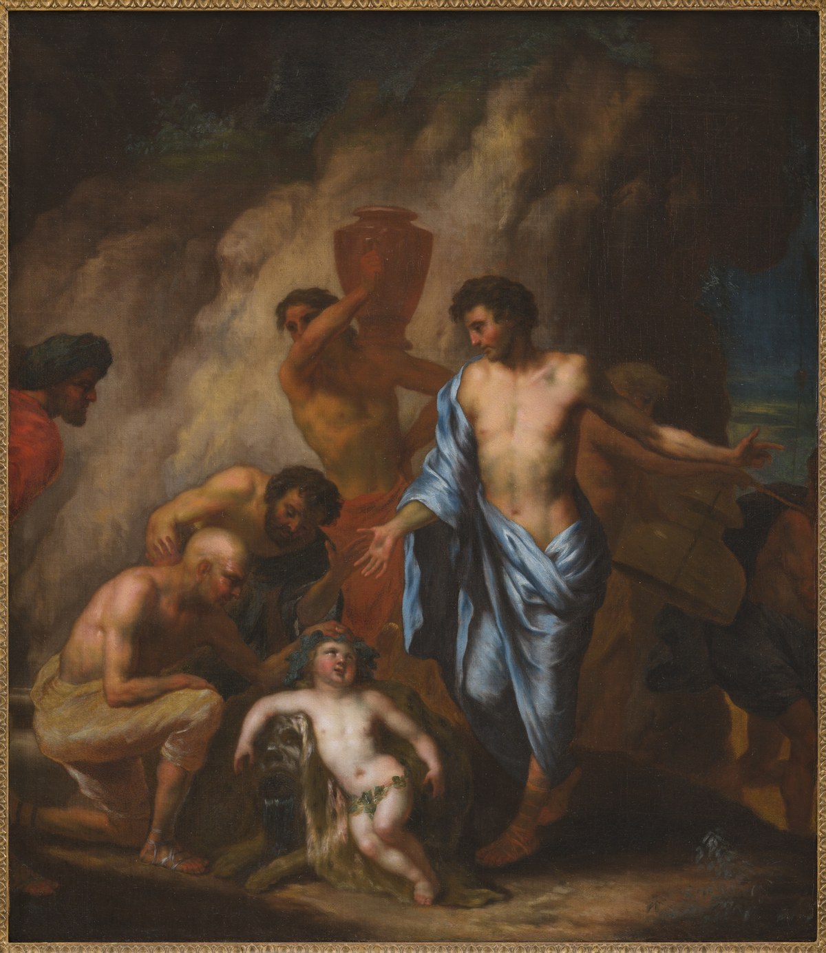 Soms is iets niet wat het lijkt. Zo bleek bij het schilderij Jonge Bacchus, dat zich al jaren als langdurig bruikleen van het Limburgs Geschied- en Oudheidkundig Genootschap in de Bonnefantencollectie bevindt. Op het werk zien we de Romeinse god van de wijn, afgebeeld als jongetje. Om hem heen staan verschillende figuren waarvan één in een helder blauw gewaad.
